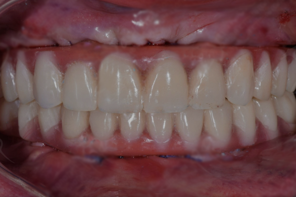 Лечение: Замена композитных реставраций двух передних зубов коронками из диоксида циркония с нанесением керамической массы.